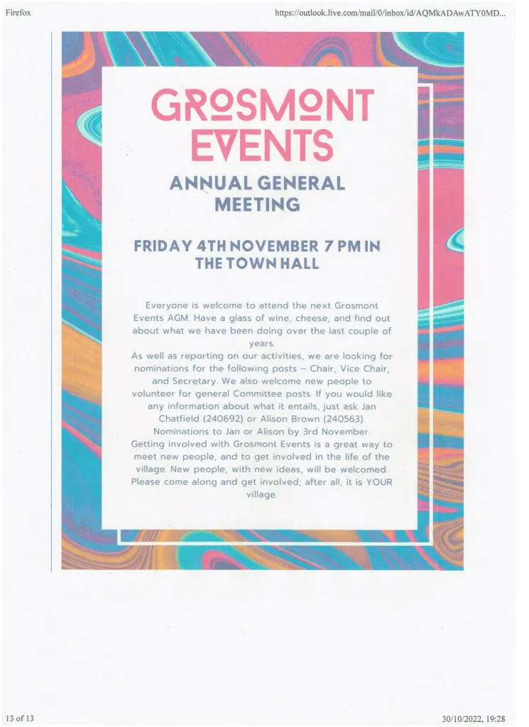 Grosmont Events – Annual General Meeting, Friday 4th November, 7pm. Cheese, wine and new people welcomed!