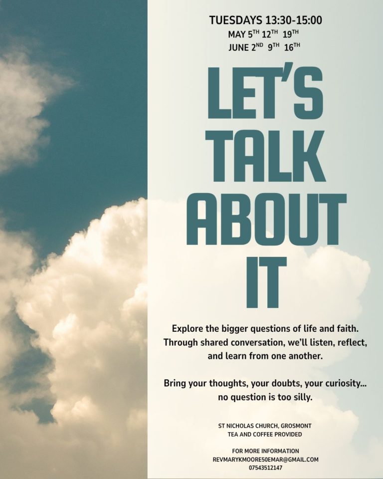 Grosmont Group of Churches are starting a six week gathering in St Nicholas .. a space for conversation about faith, life and everything in between. This isn’t a course or a bible study .. but a chance to have a cup of tea and talk, to listen and share alongside others. All welcome. Tuesdays 13:30-15:00 Please see poster for dates.